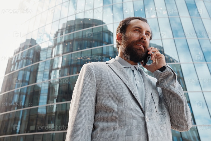 Разговоры по телефону за пределами современного офисного здания