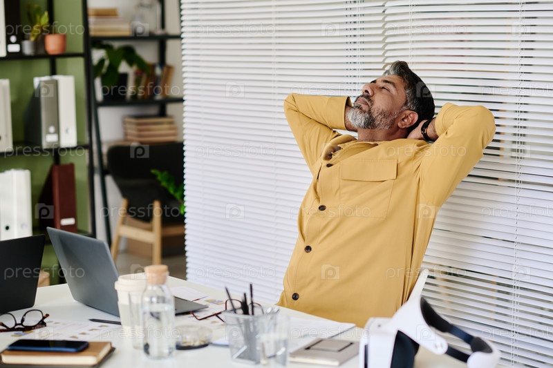 Расслабляющий бизнесмен растягивается в современной офисной среде