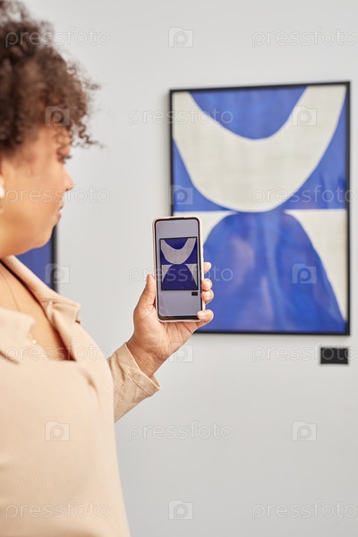 Черная женщина держит смартфон в музее