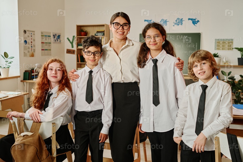 Молодая учительница и ее студенты групповой портрет