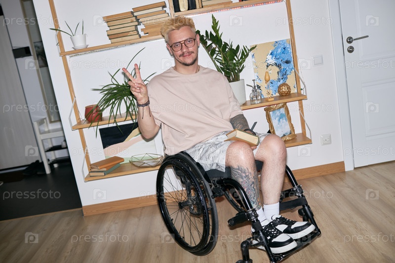 Улыбающийся мужчина в инвалидном кресле дает знак мира дома