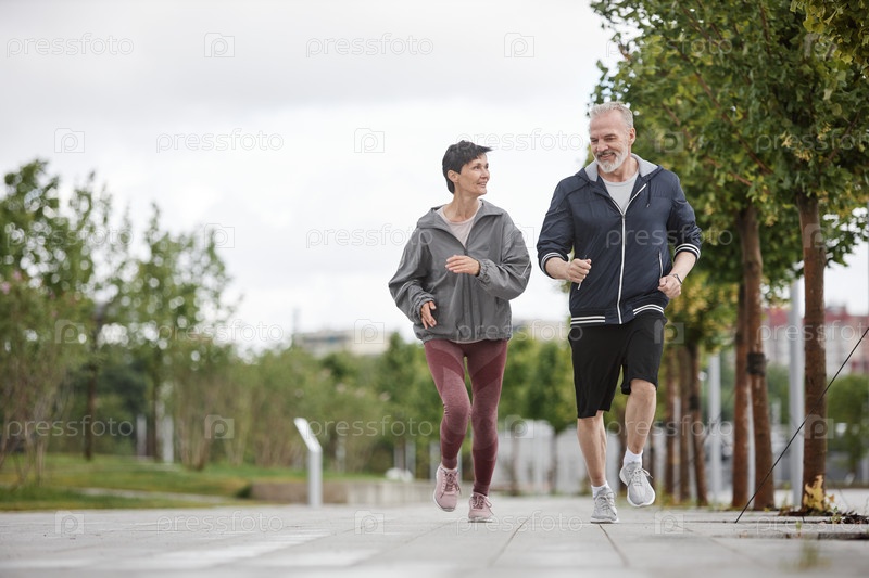 Пара зрелых мужчины и женщины бегут вместе в городском парке
