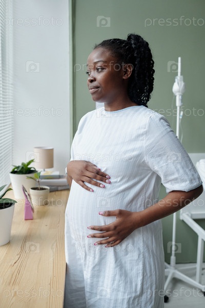 Беременная женщина стоит у окна и задумчиво смотрит