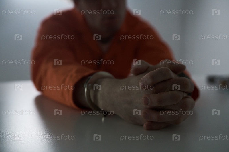Прикованный в наручники заключенный сидит в комнате допросов
