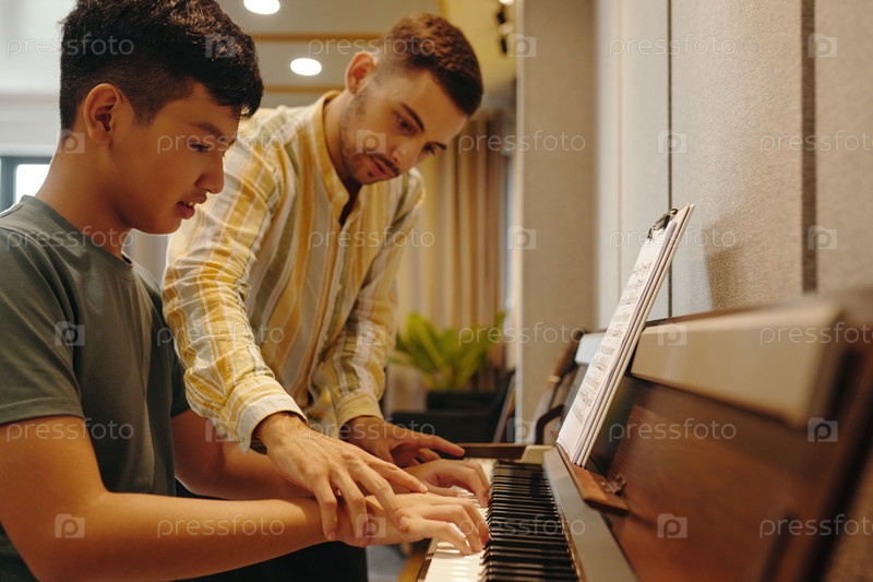 Преподавание уроков фортепиано в современной комнате без естественного света