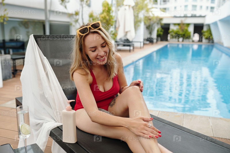 Улыбающаяся женщина отдыхает у бассейна в курортной обстановке