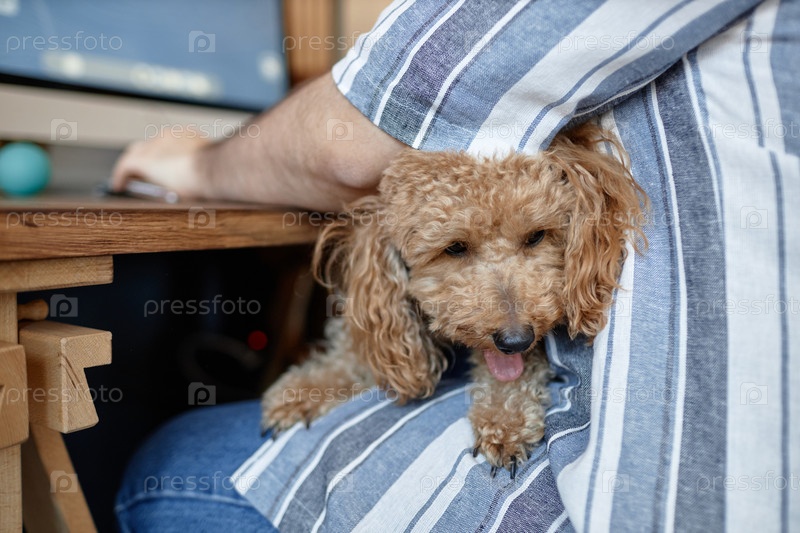 Очаровательная собака, опирающаяся на человека возле деревянного стола