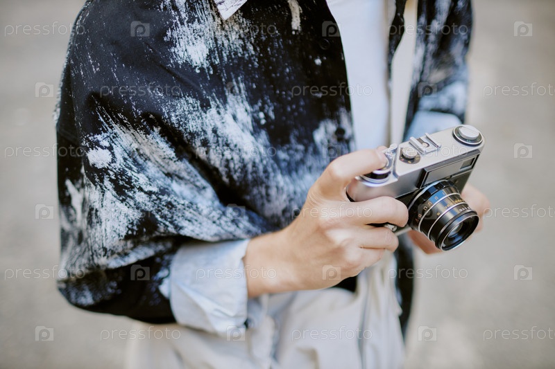 Держит винтажную камеру в удобной голубой рубашке