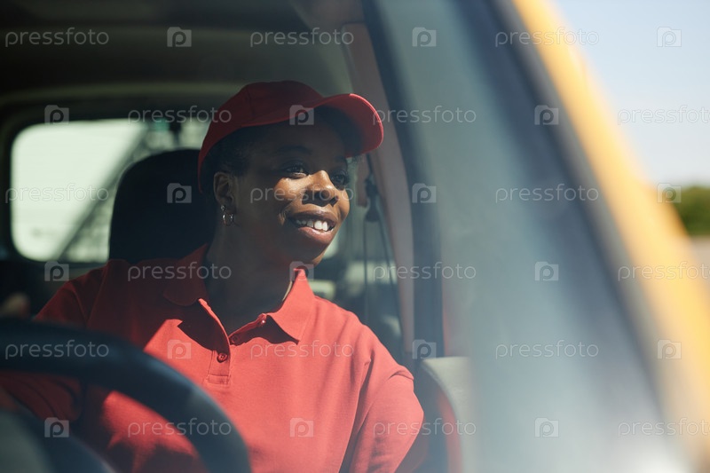 Ведущая счастливую женщину-работницу в грузовике для доставки