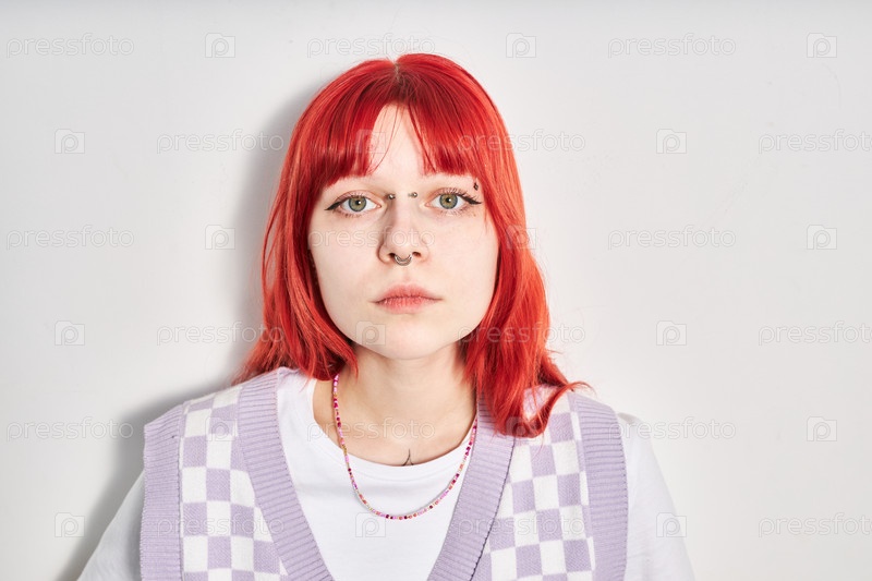 Портрет молодой женщины с ярко-красными волосами на белой стене