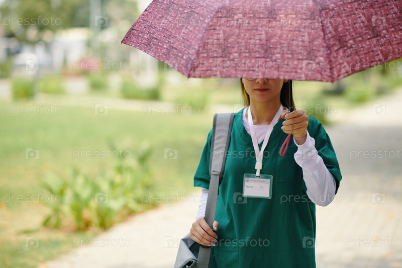 Медсестра ходит среди открытой зелени, держащая розовый зонтик