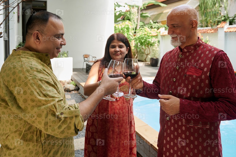 Друзья пьют красное вино на свежем воздухе