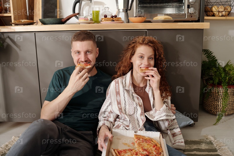 Пара кусает ломтики аппетитной пиццы