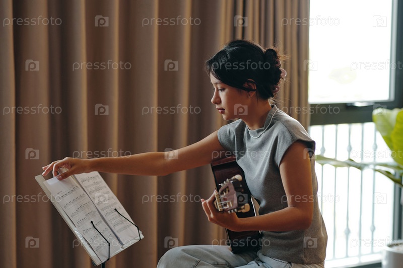 Концентрируясь на практике гитары, читая листовку музыки