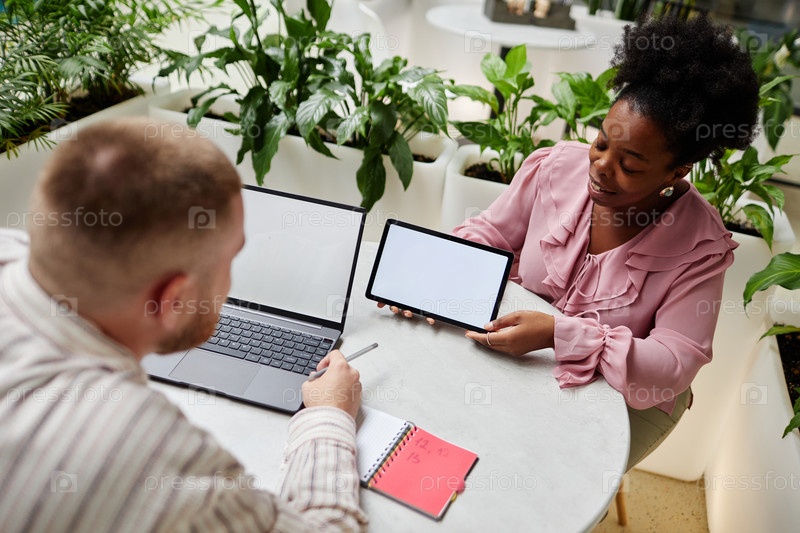 Черная женщина держит планшет, показывая коллеге проект работы на встрече в кафе