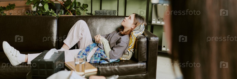 Расслабляющая женщина, отдыхающая на диване в уютной гостиной