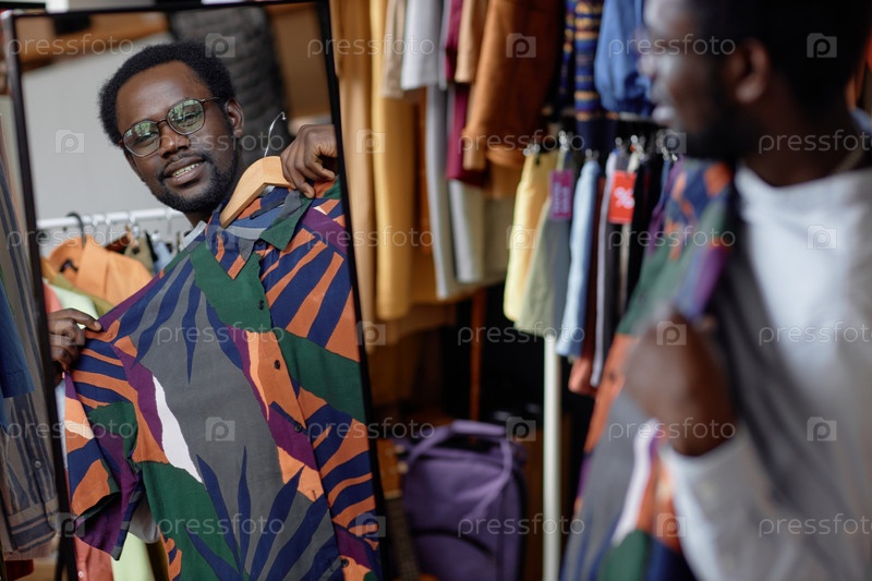 Отражение в зеркале чернокожего мужчины, покупающего рубашки в магазине