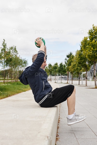 Пожилой мужчина сидит в статическом подходе Строительство задниц в городском парке