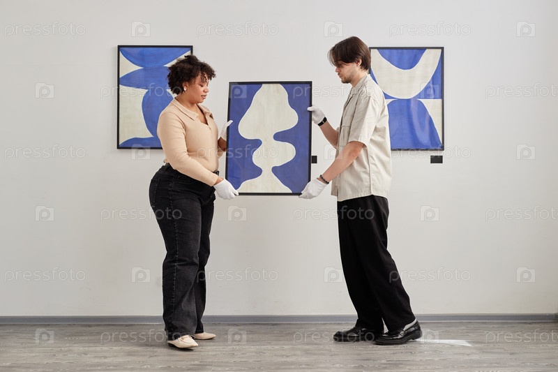Два человека проводят выставку планирования живописи в художественном музее
