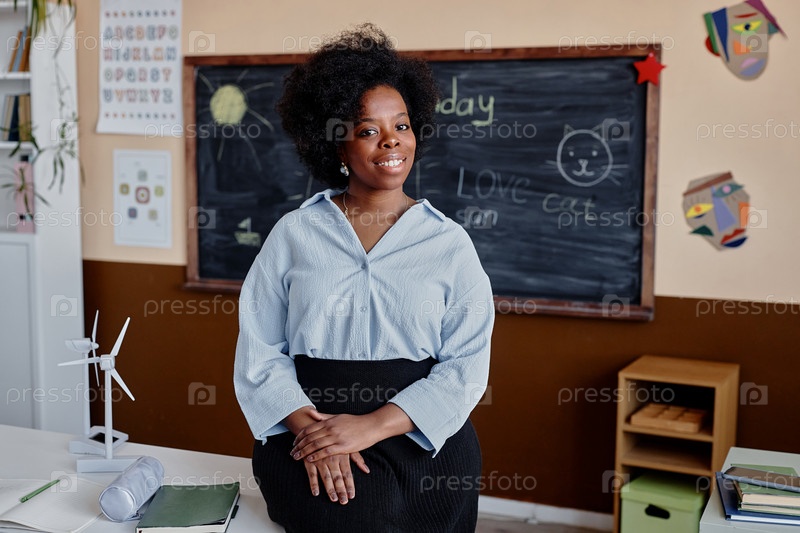 Портрет улыбающейся учительницы начальной школы в классе