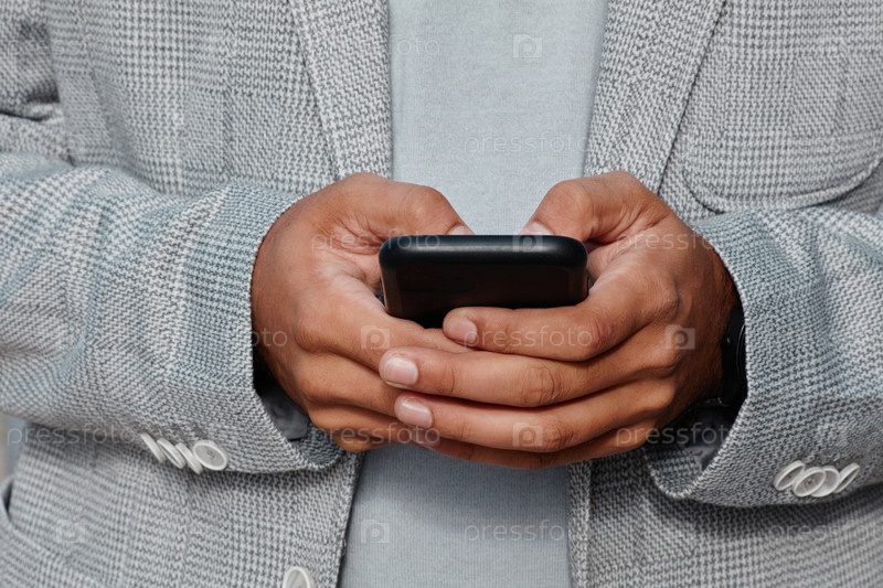 Мужчина, носящий серый блейзер, держащий смартфонное устройство