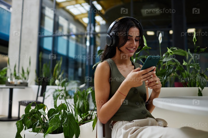 Улыбающаяся женщина смотрит на телефонный экран Слушает музыку в наушниках за столом кафе