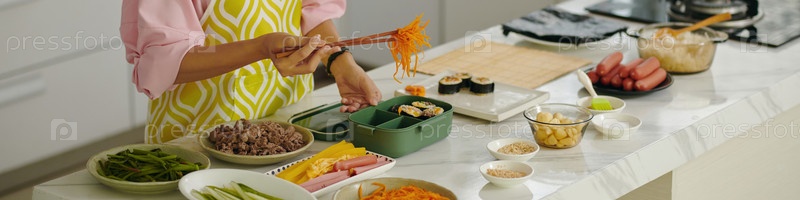 Домашняя хозяйка упаковывает еду в ящик для обеда на кухне