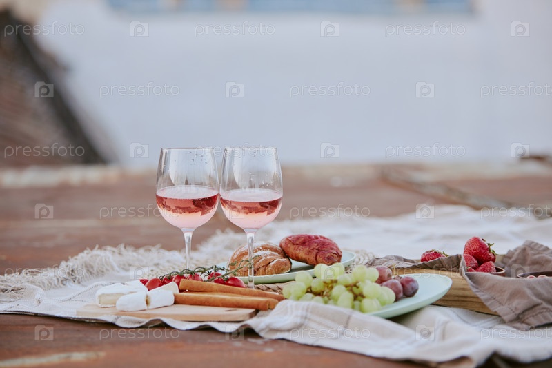 Наслаждаться розовым вином со свежими фруктами и сыром на открытом воздухе