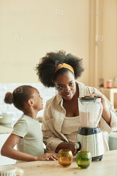 Улыбающаяся чернокожая женщина с помощью блендера слушает, что говорит дочь на кухне