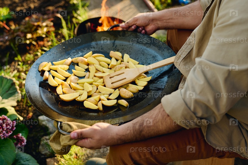 Держу сковородку с нарезанными картофелями