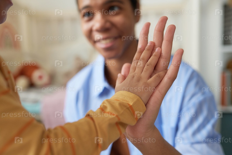 Улыбающийся ребенок и взрослый касаются ладоней в утреннем свете