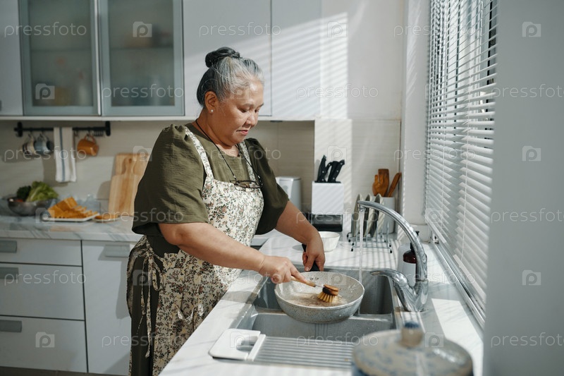 Старшая женщина моет посуду на кухне
