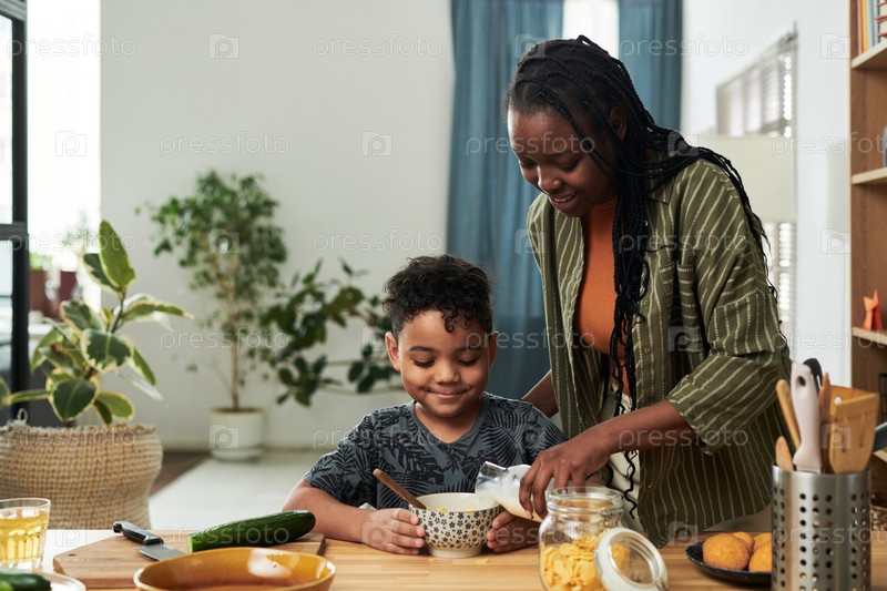 Молодая мать наливает свежее молоко в миску