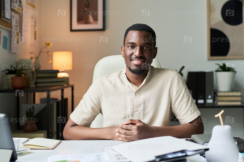 Портрет улыбающегося мужчины, сидящего за столом в современном офисе