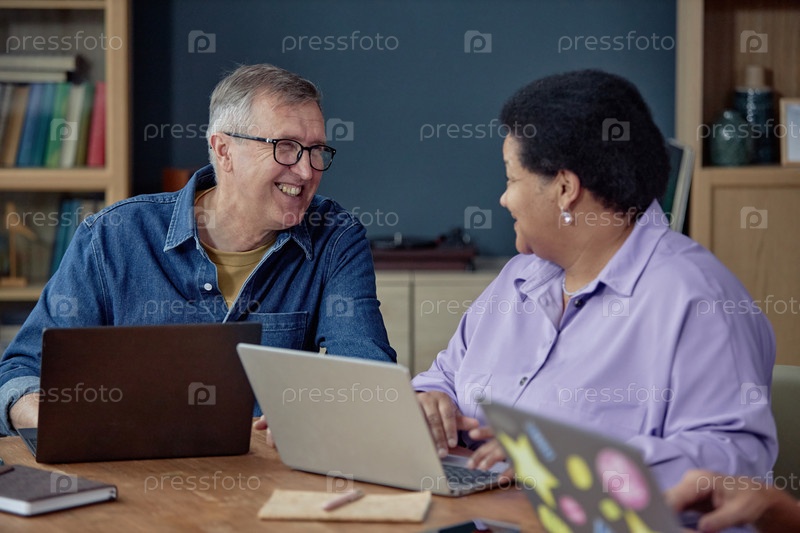 Улыбающийся зрелый мужчина разговаривает с женщиной, используя компьютер