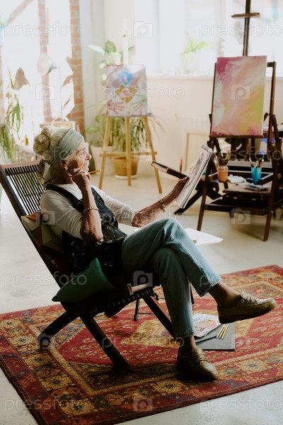 Креативная старшая женщина смотрит на эскиз