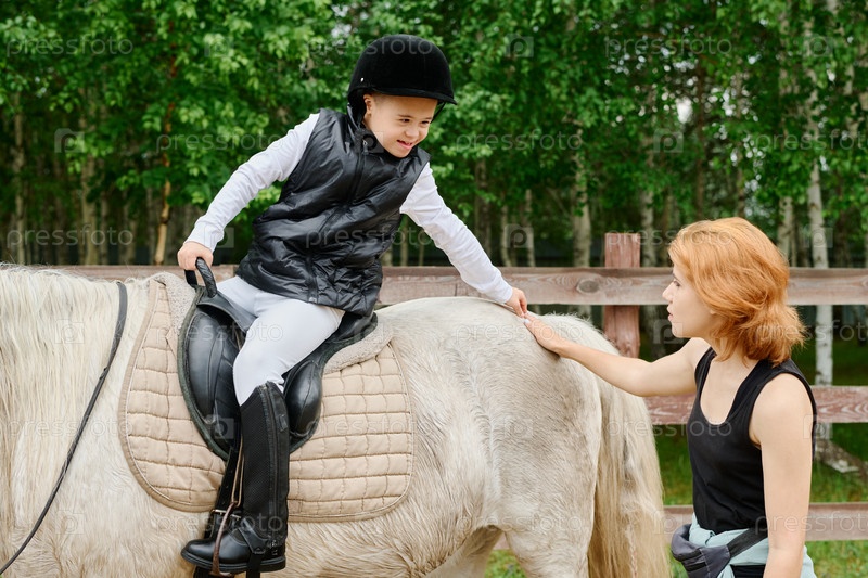 Улыбающийся ребенок едет на белом коне, получая инструкции