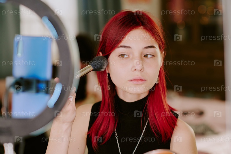 Применение макияжа с помощью кисти и косметического зеркала Ring Light