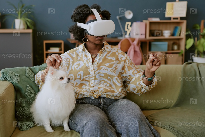Участие в виртуальной реальности с питомцем на диване