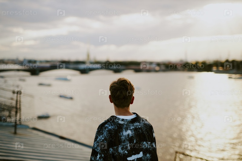 Наблюдение за городским ландшафтом с рельсов на берегу воды во время захода солнца
