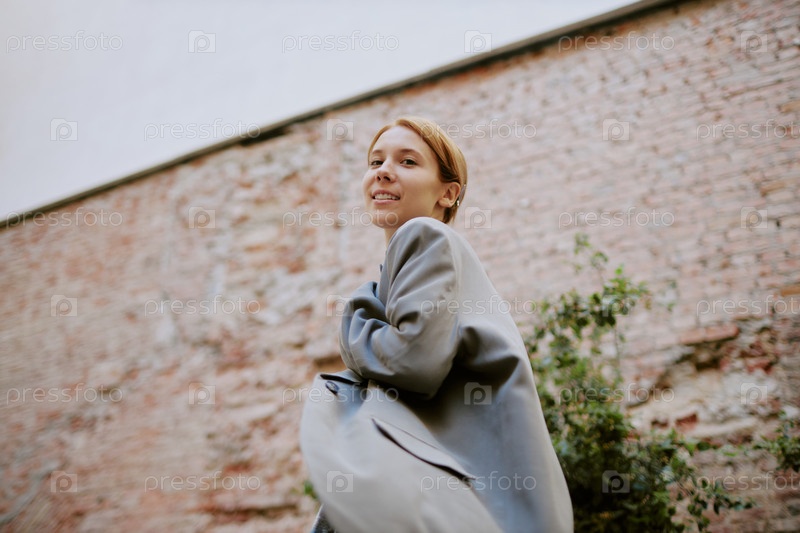Улыбающаяся женщина ступает на улице против кирпичной стены