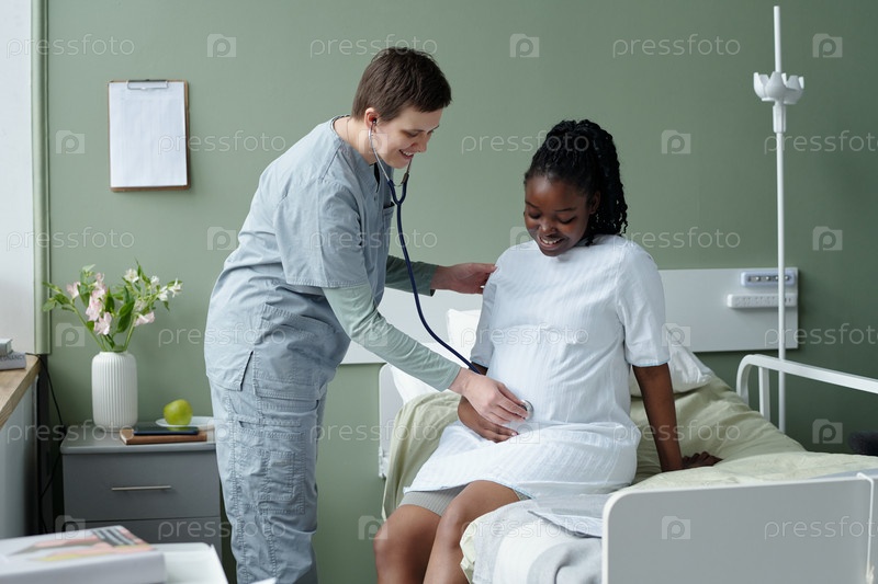 Заботливая медсестра слушает живот беременной женщины в больничной комнате