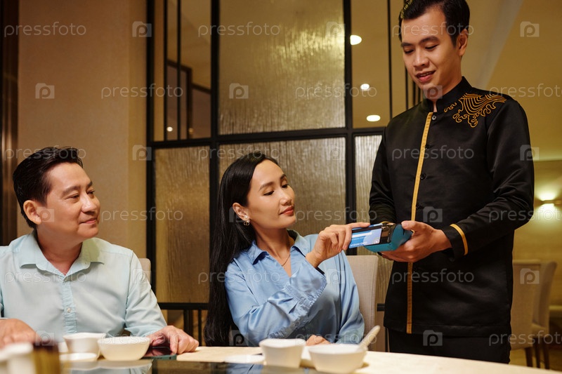 Женщина платит за ужин в ресторане