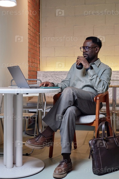 Мужчина пьет кофе, работая на ноутбуке в офисе