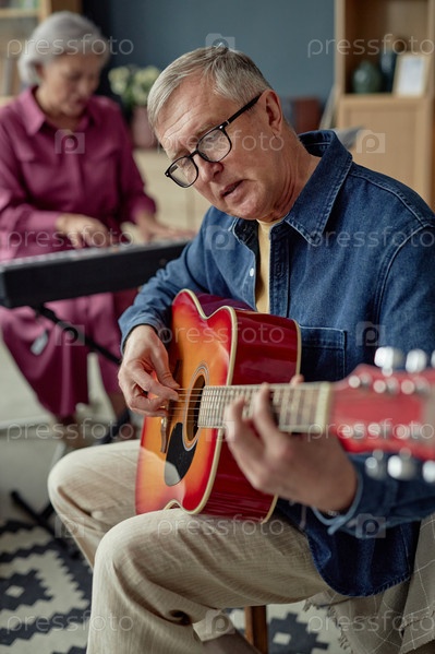 Зрелый мужчина играет на гитаре, поёт песню