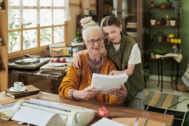 Пожилая женщина читает бумаги с молодой девушкой в уютной комнате