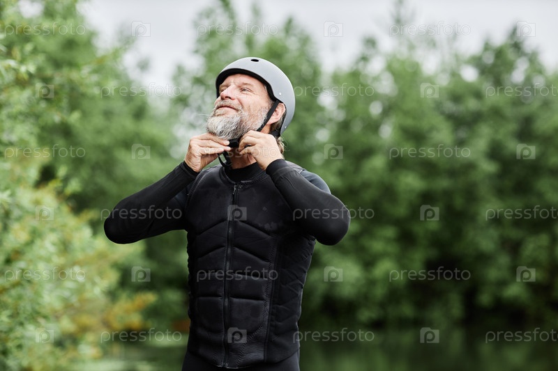 Бородатый старший мужчина надевает костюм и шлем
