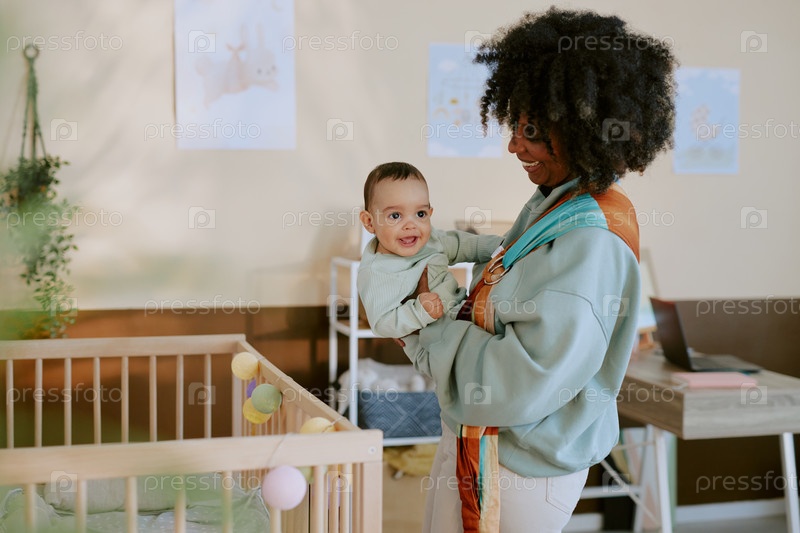 Афроамериканская мать держит ребенка в детском саду