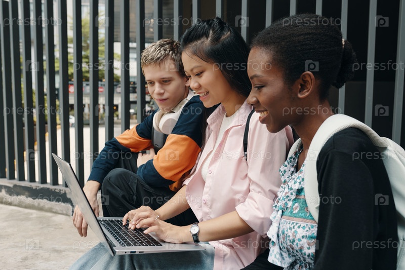 Студенты, использующие ноутбук вместе на открытом воздухе