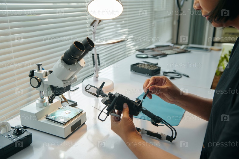 Мастер по ремонту сломанного беспилотника в мастерской